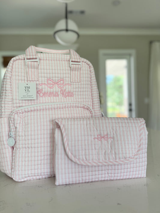 TRVL PINK PIMLICO STRIPE QUILTED DIAPER BAG, CHANGING PAD AND EVERYDAY BAG SET