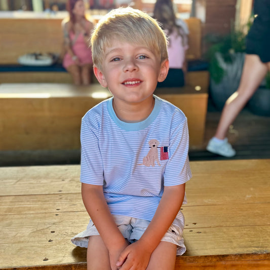 Embroidered SS Light Blue Stripe Puppy/Flag Tee/Bubble