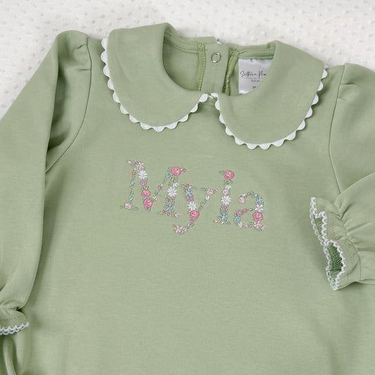 Scalloped Sage Embroidered Floral Name Bubble