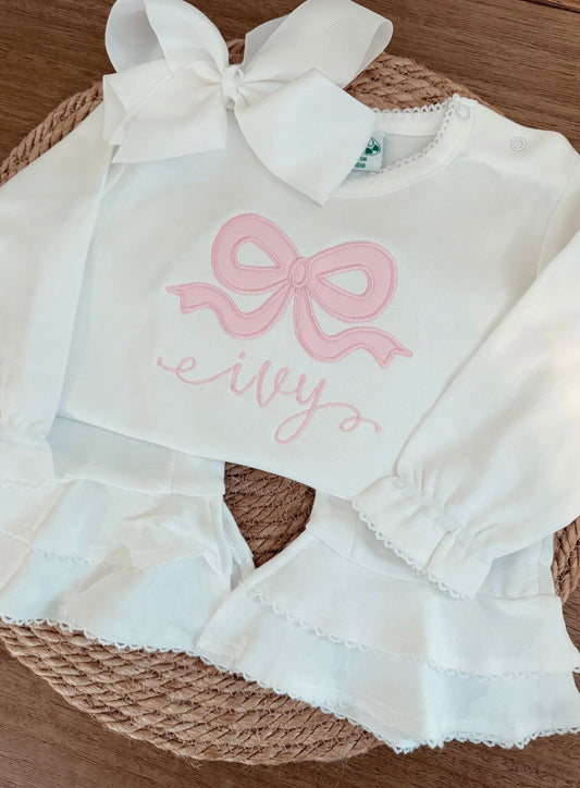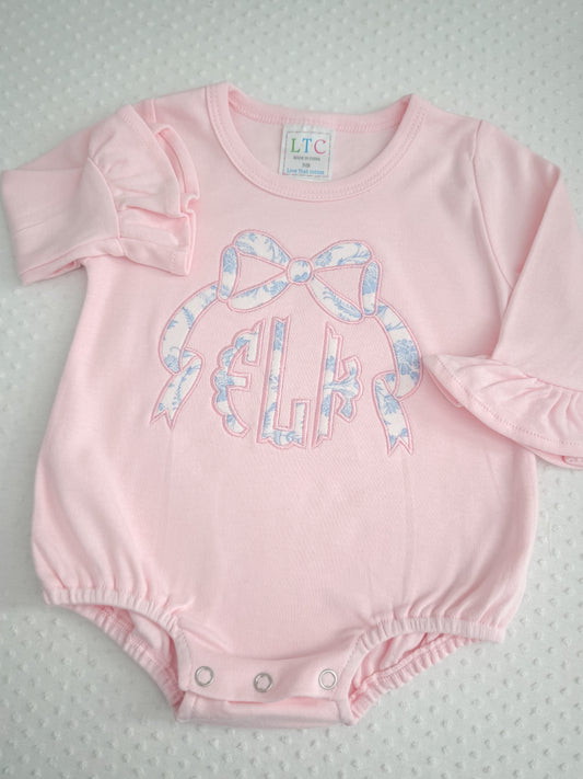 LS Ruffle Appliqué Bow Monogram Bubble
