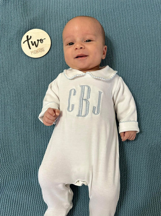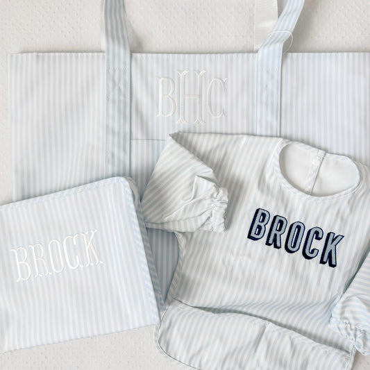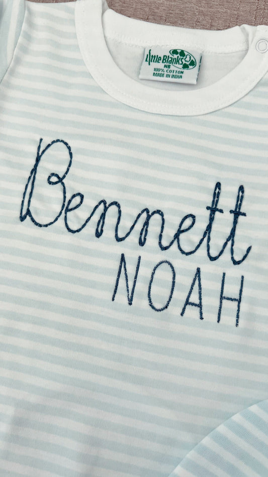 Embroidered Baby Blue & White Stripe Romper+Hat