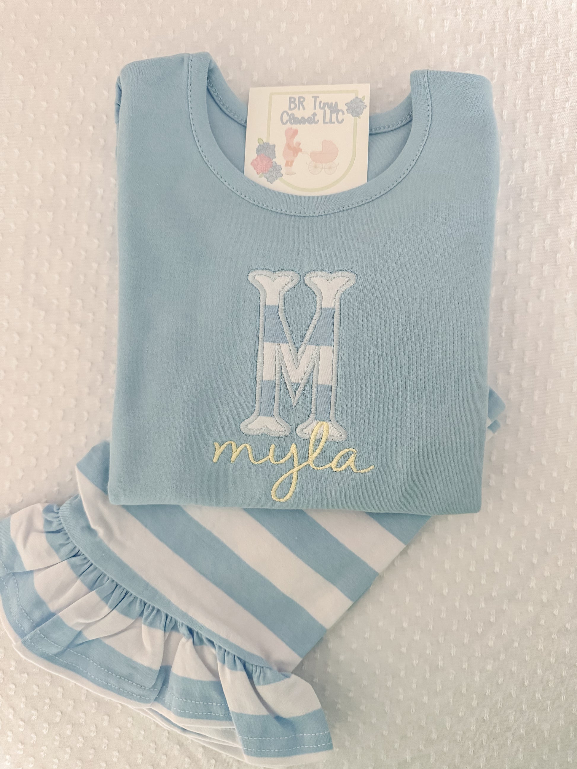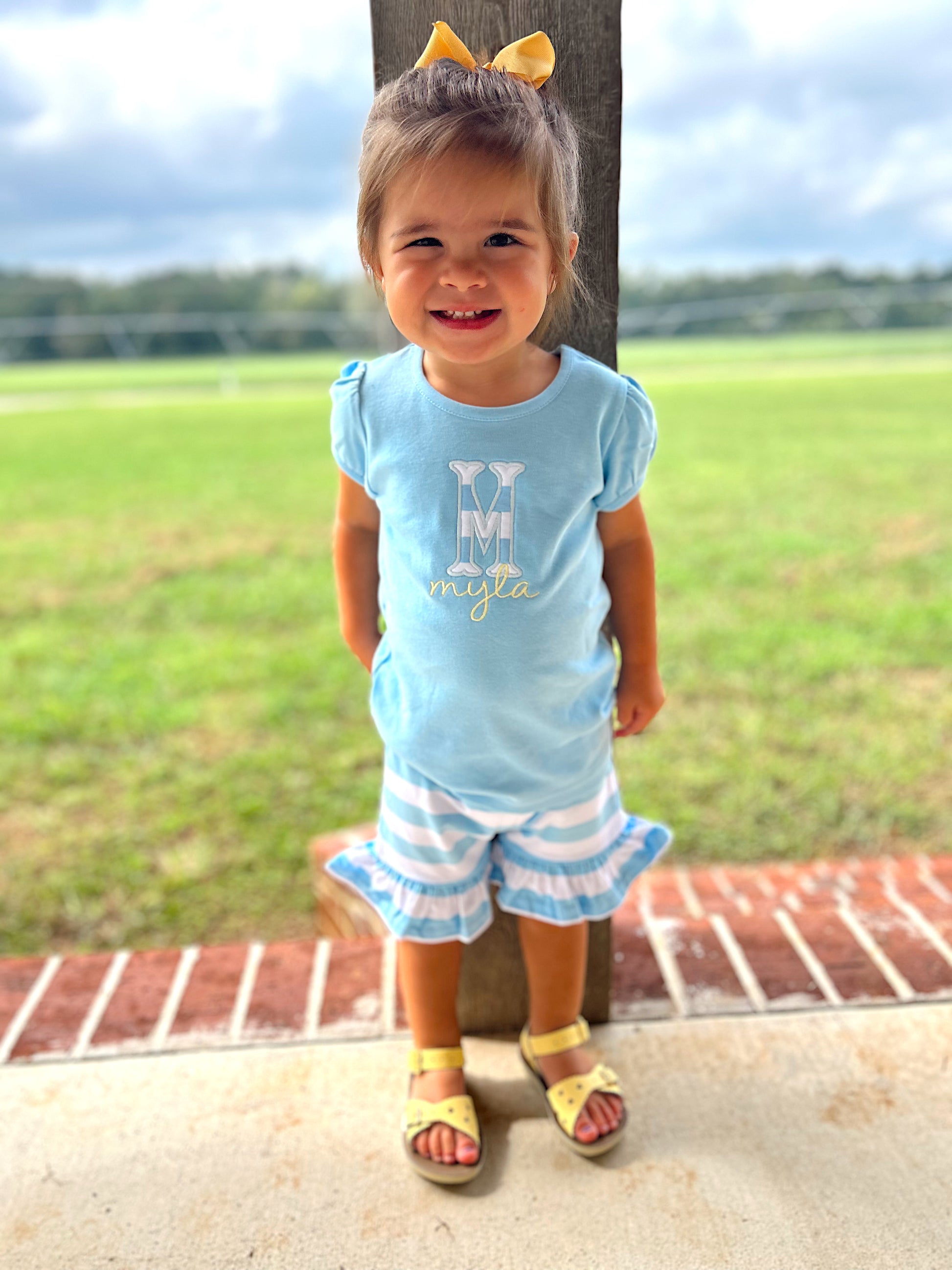 Blue puff sleeve tee is pictured with ruffle stripe shorts. We use the highest quality blank clothing. 100% combined cotton material and true to size. Please make sure you add both the shirt and shorts, if you want a set. I have them listed separately so that you can mix and match sizes, if needed.
