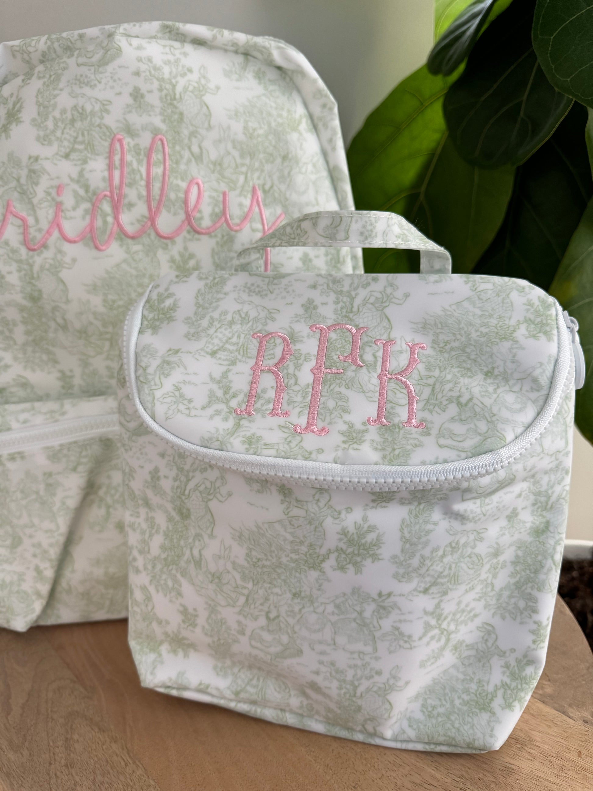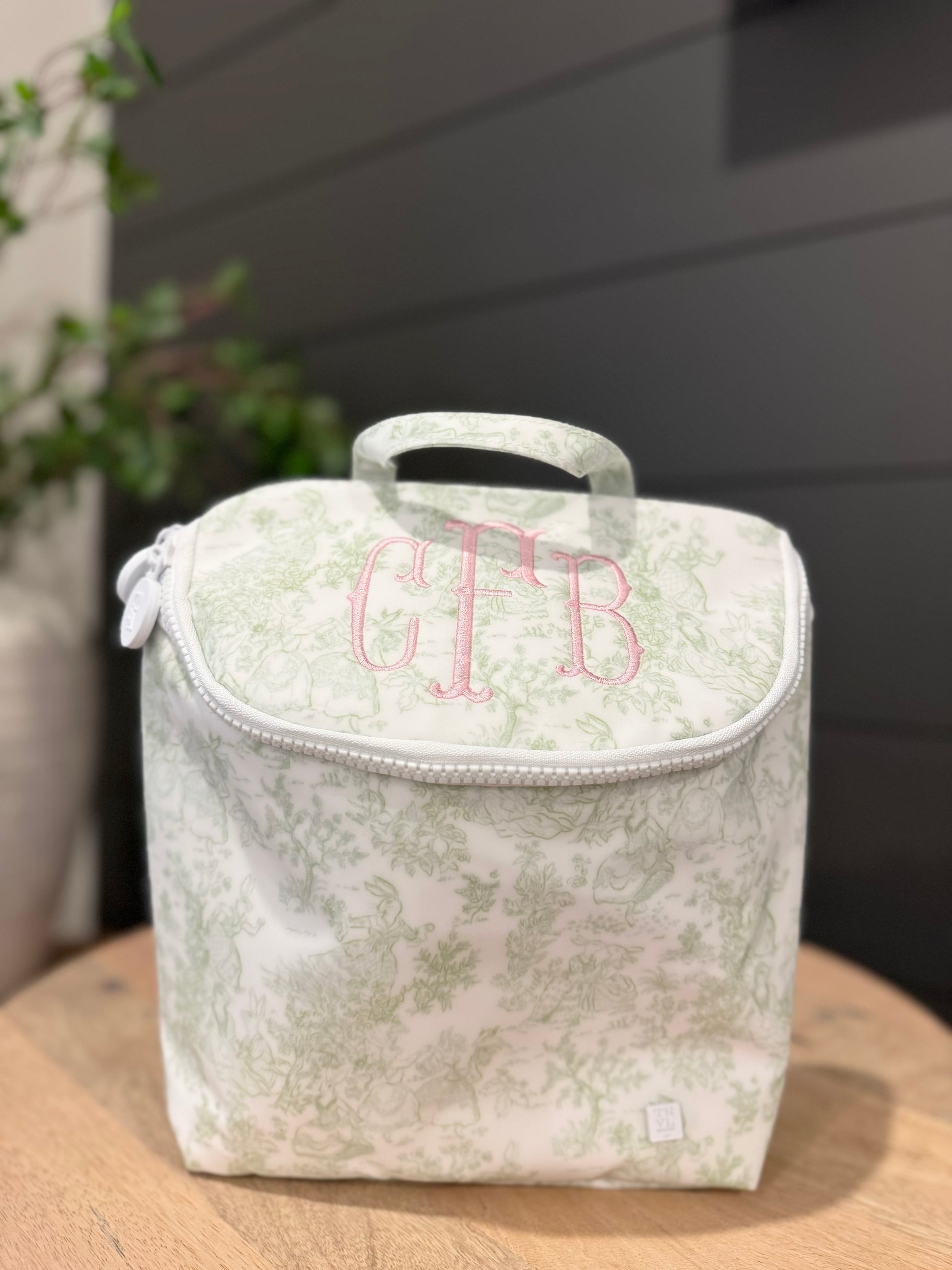 Thread color pictured is a light pink. Whether heading to preschool, day care, camp, or a family outing, our adorable Take Away has plenty of room for your child's meal, drink, and a snack. It's compact enough to fit inside their backpack and the 2-way zip design makes it simple for kiddos to open themselves. Perfect storage for baby bottles too and has an inside mesh pocket for ice packs, love notes and fits most bento-style lunch boxes and a beverage.