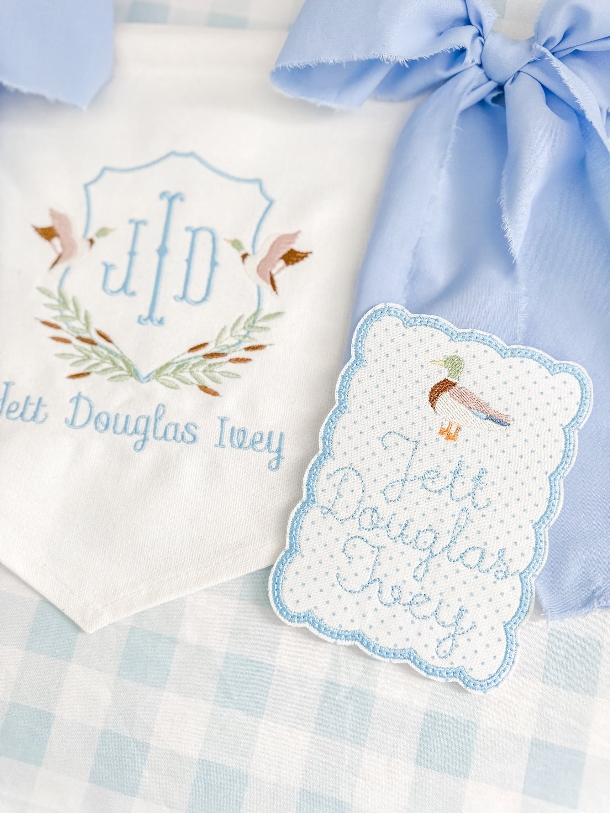 Please put babies FULL name in the personalization box. Initials will be monogrammed in first, LAST, middle format. Name tag is NOT INCLUDED