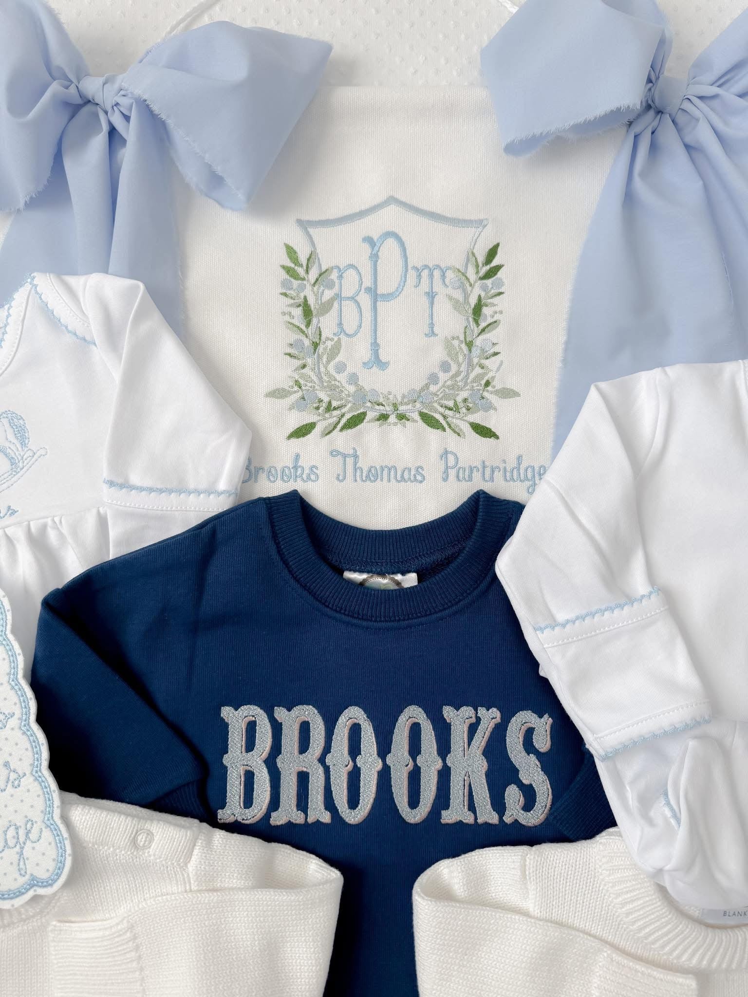 Please put babies FULL name in the personalization box. Initials will be monogrammed in first, LAST, middle format. **bassinet banner NOT included**