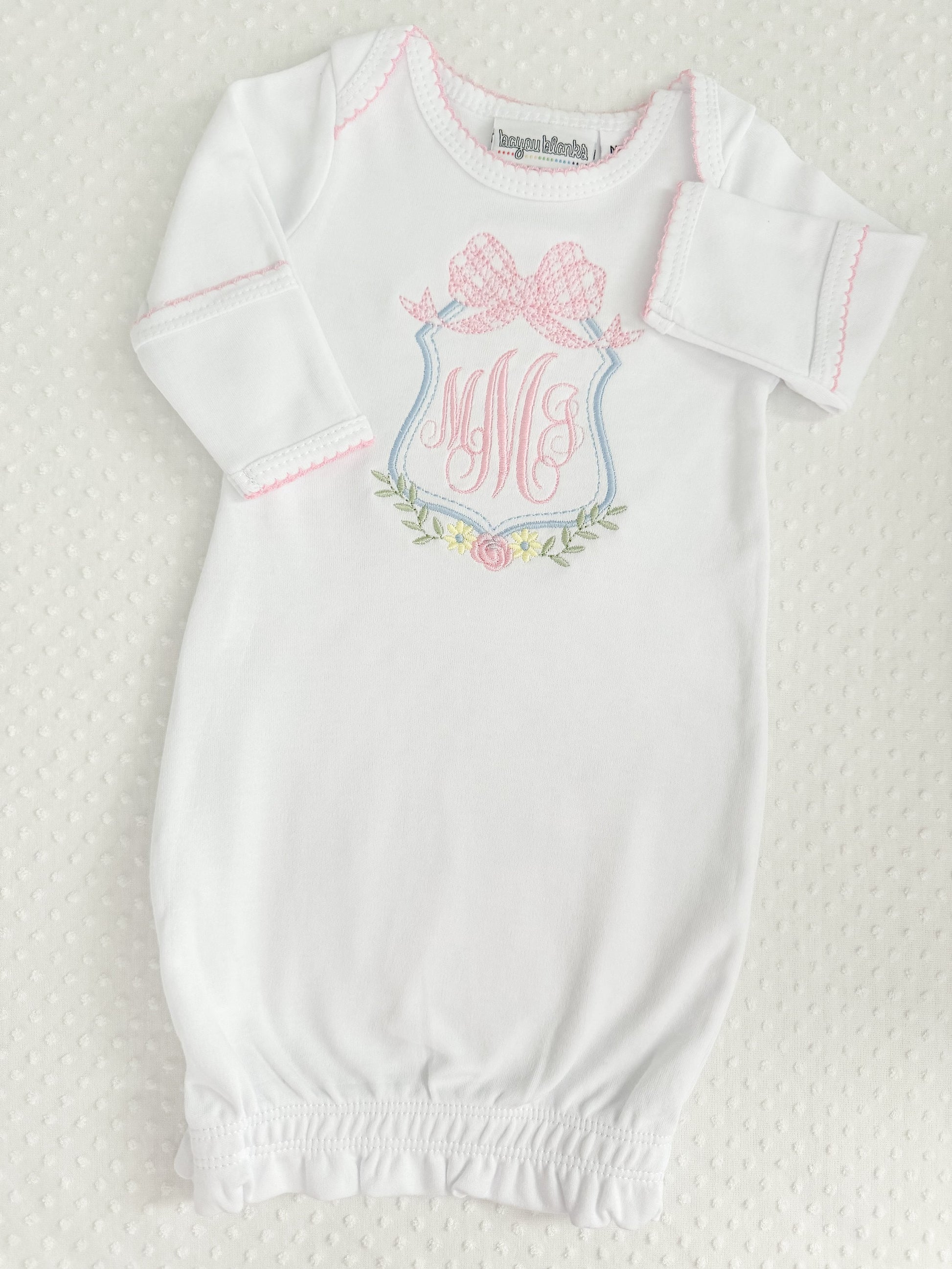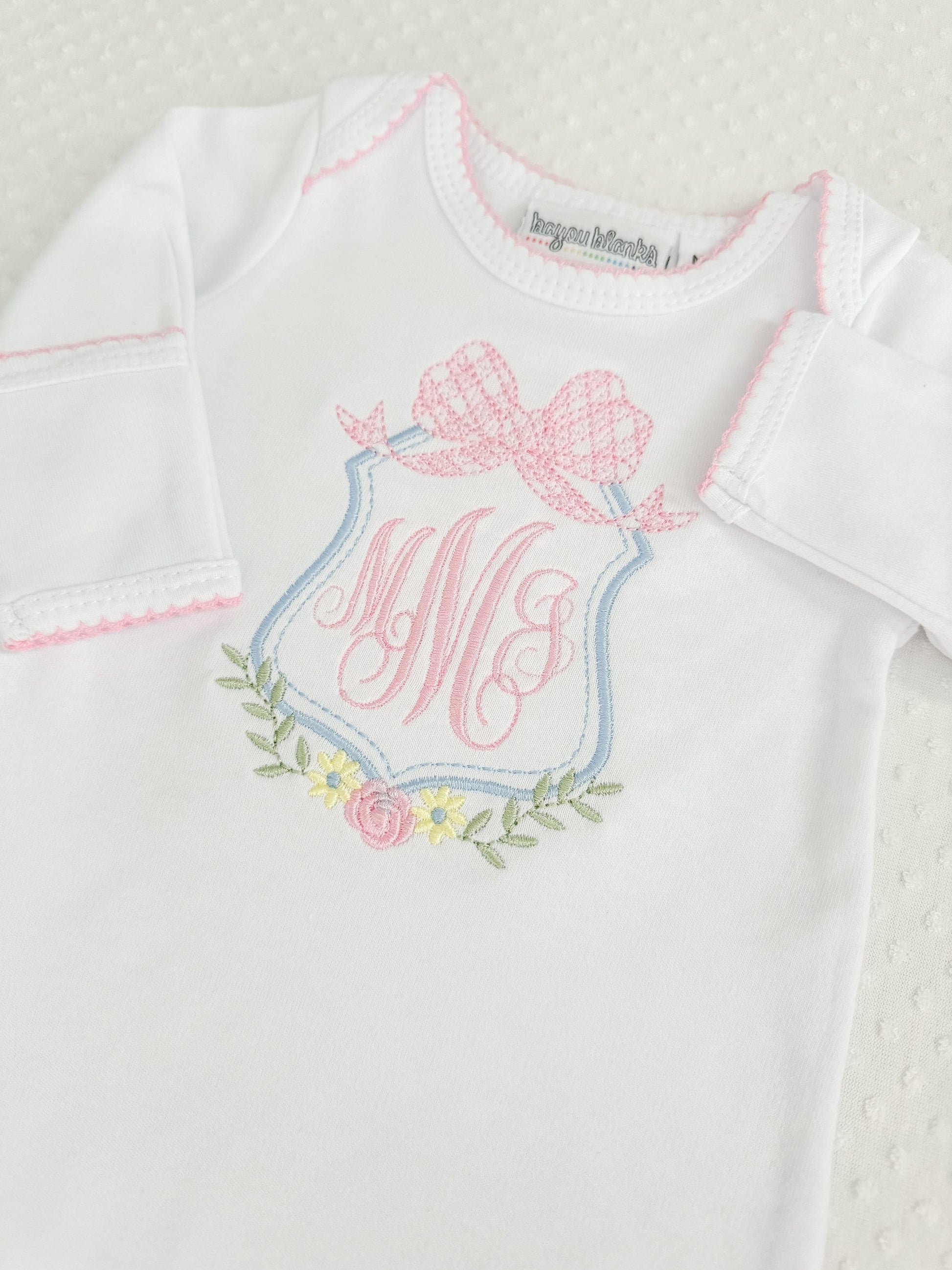 This gown has the sweetest picot trim, fold over cuffs for baby’s hands, and a hidden zipper for easy diaper changes. We use the highest quality blank clothing.