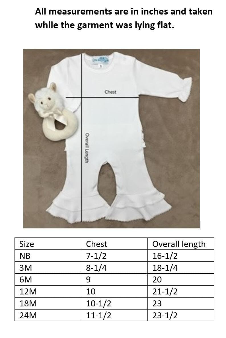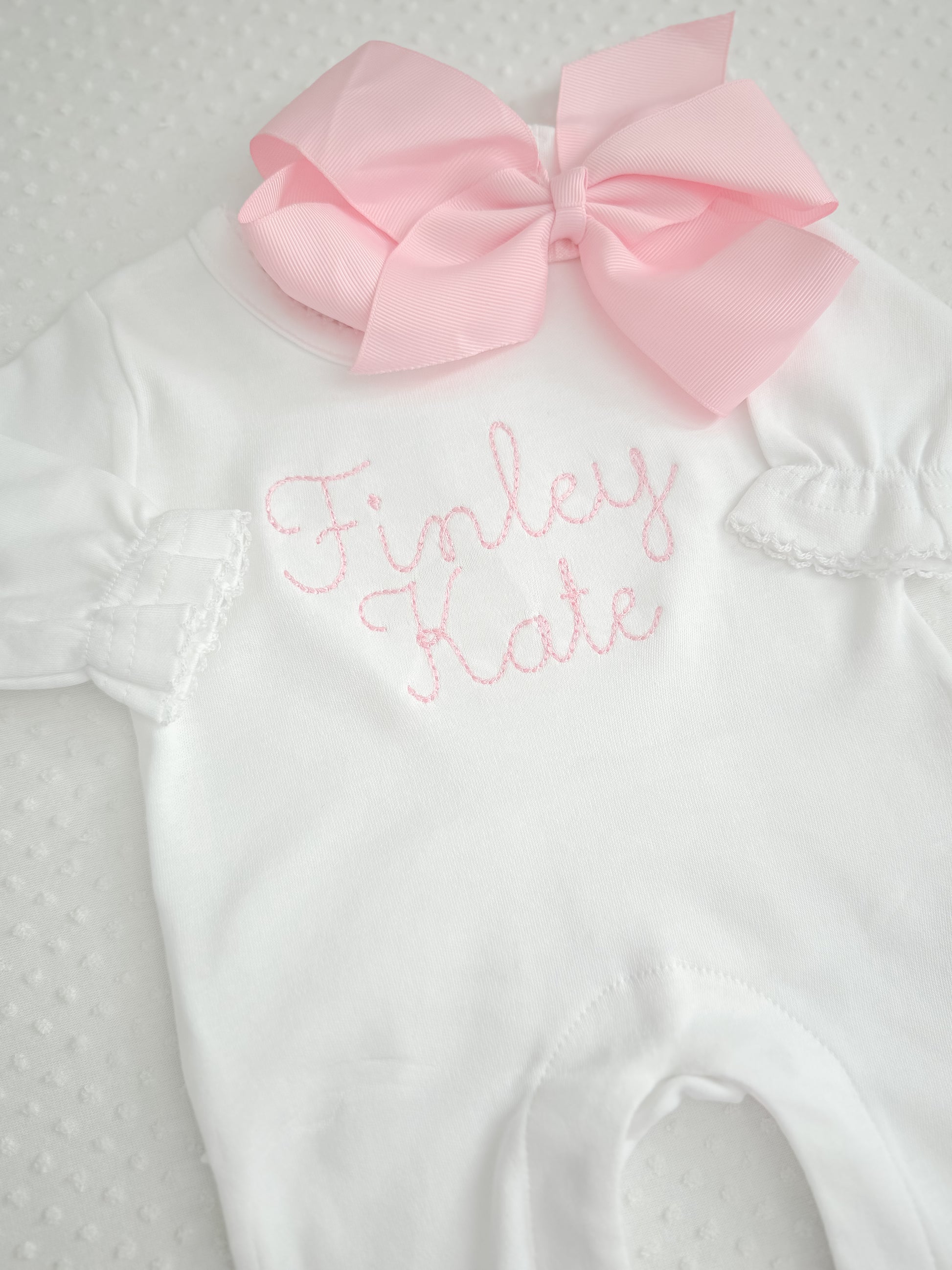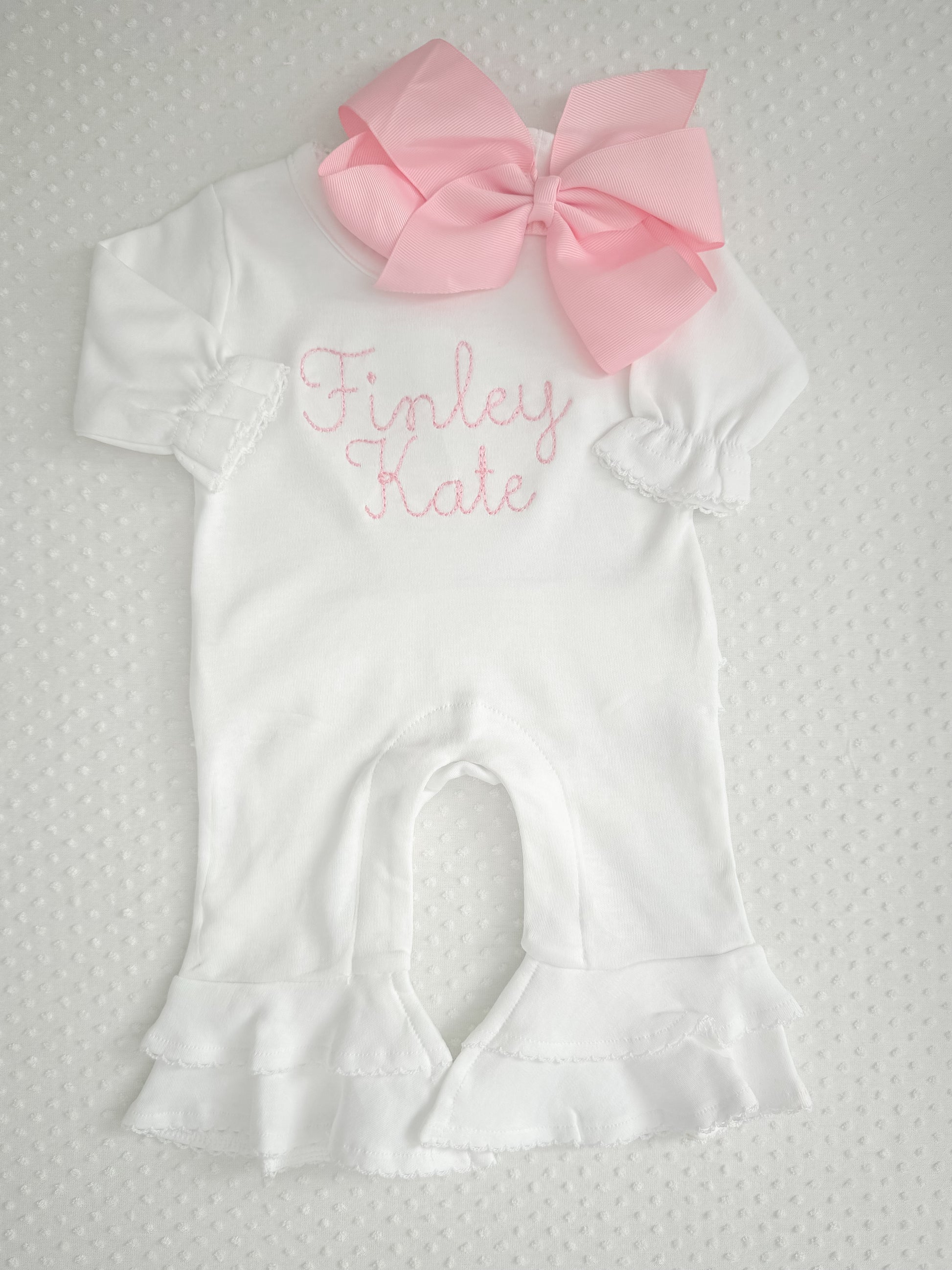 *Please note that the same pink thread color is used for both rompers that are pictured, but different lighting. A lilac thread is also pictured.