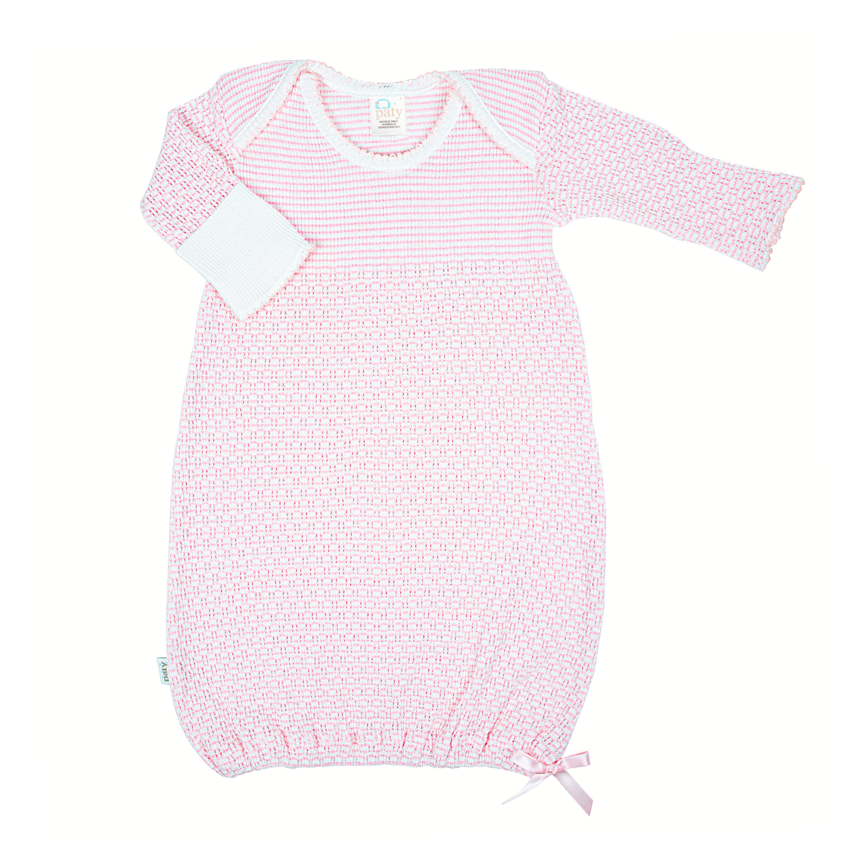 Our best selling take-home outfit! This gown includes a convenient elastic bottom for easy diaper changes, making it a favorite for newborns. An overlap shoulder design ensures gentle dressing, providing a cozy fit without disturbing your little one. This particular knit style runs generously.