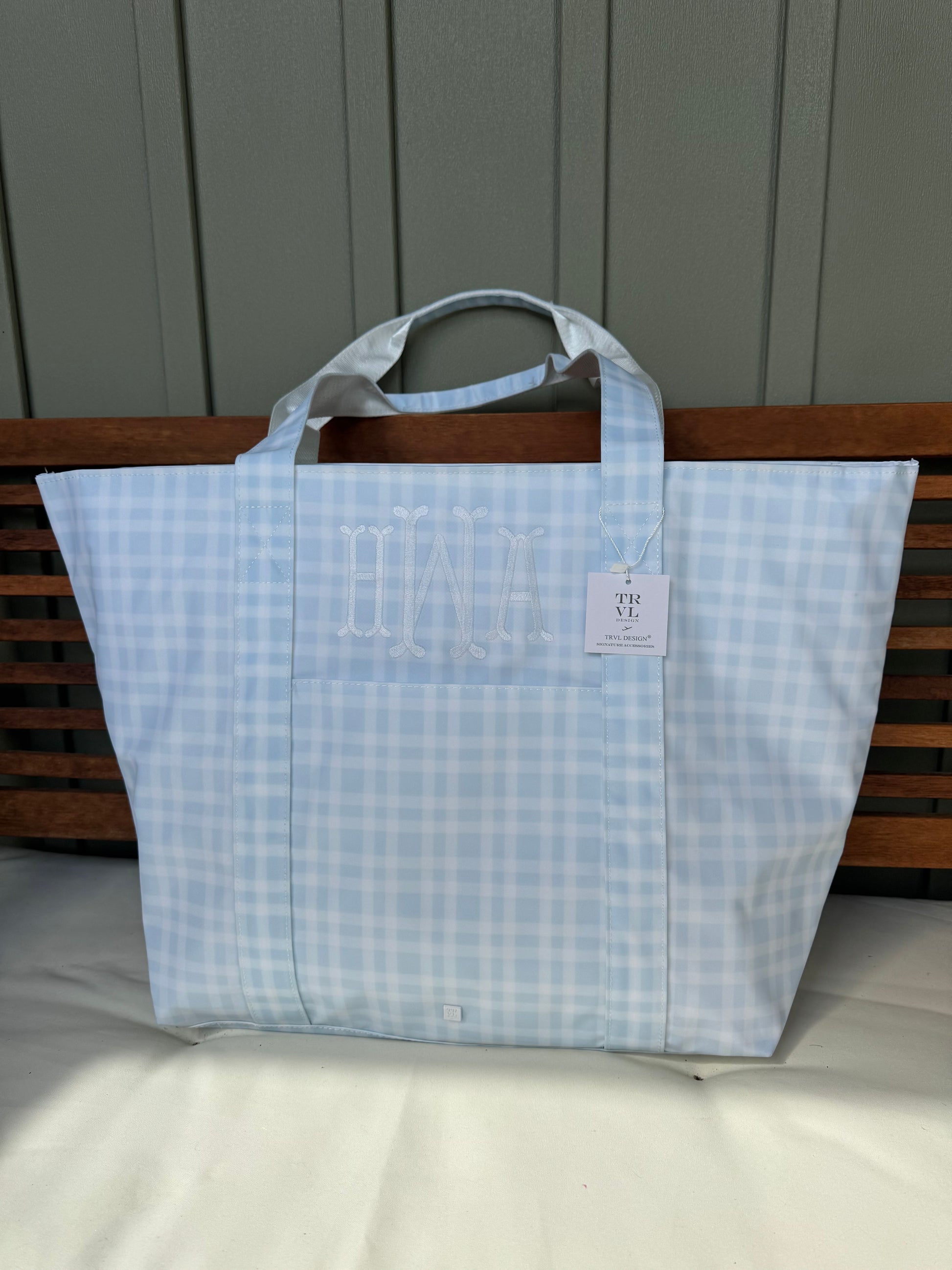 Get around effortlessly with our Jumbo Tote. This do-it-all lightweight tote is useful year-round for all occasions - as a beach bag or for your everyday needs. Underneath the strap is satin webbing designed to prevent from slipping, an interior full slip pocket and zip pocket, a front exterior pocket, and an exterior trolley passthrough.