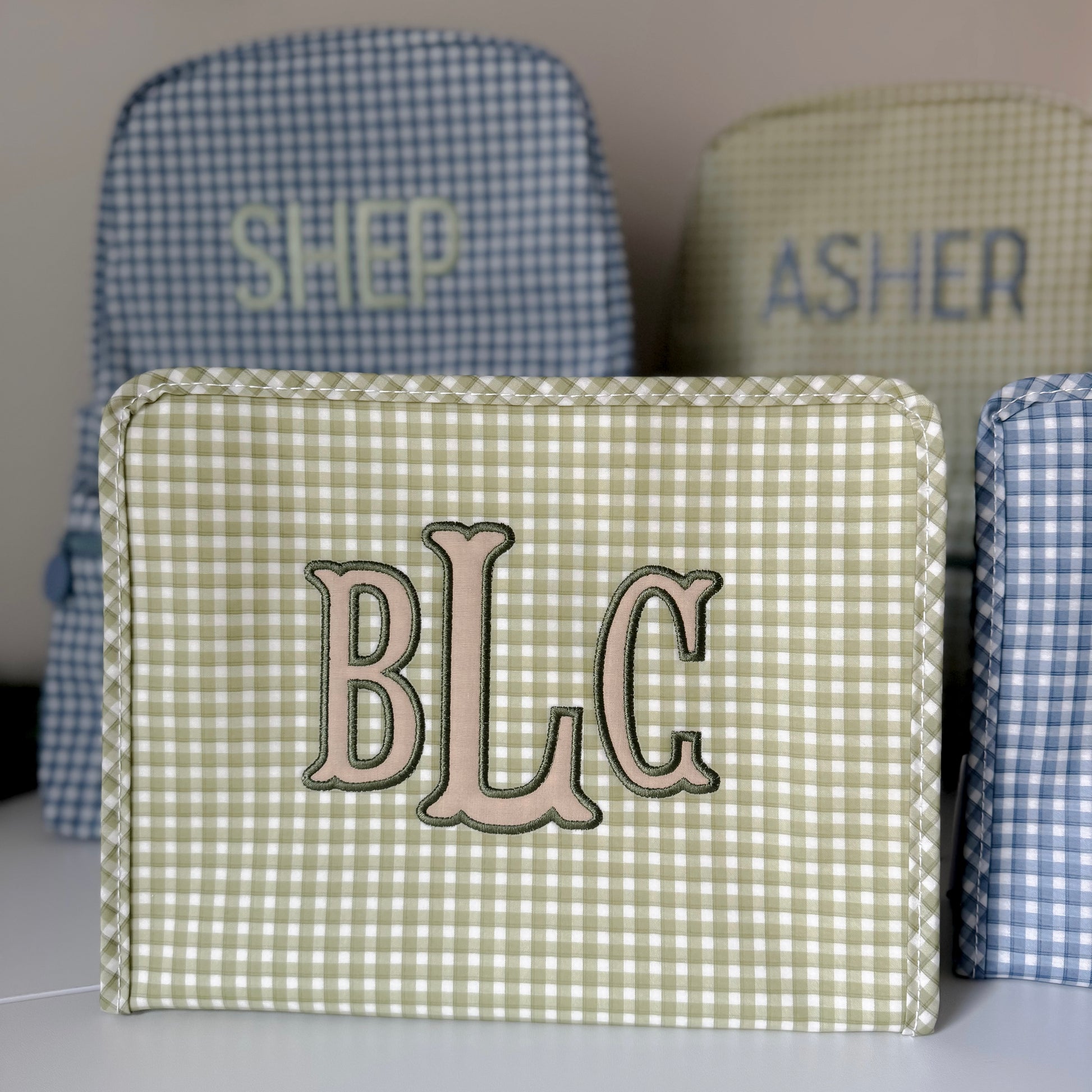 Our best-selling Roadies are our BFFs in the pouch world! Available in 2 sizes, our Roadie is made in a cotton gingham with a thin Eco-friendly matte coating, an inside slip pocket and exterior snap open zip tabs for a wider opening and an easier access.
