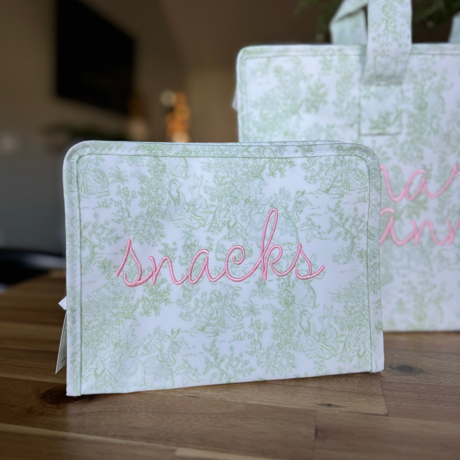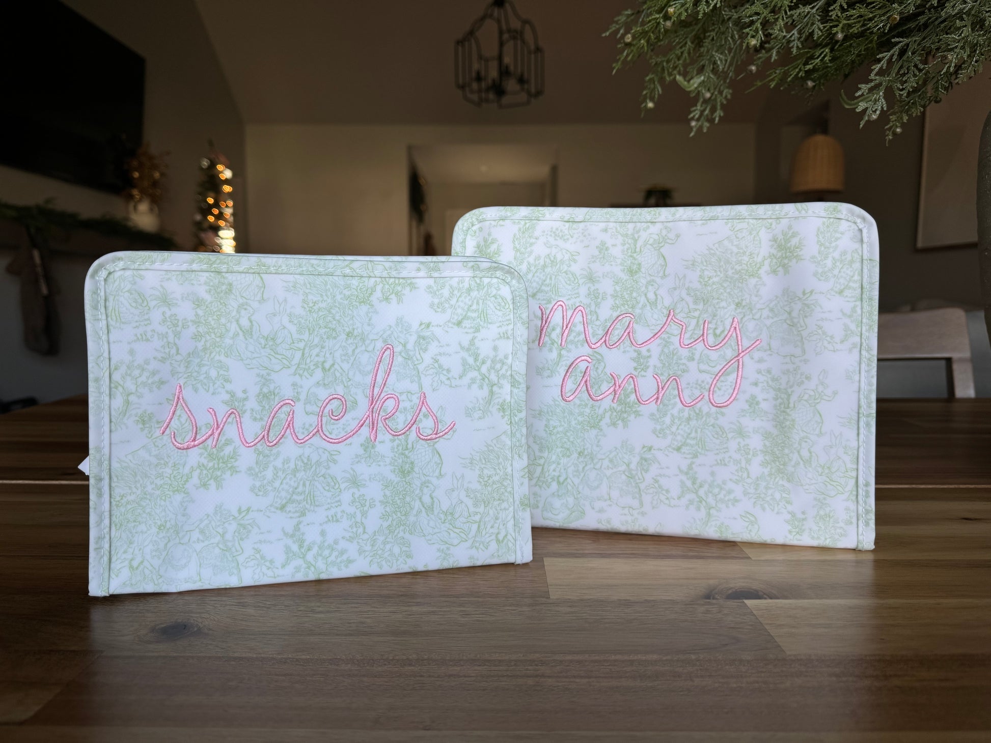 Thread color will be pink. This print is available in 2 sizes, our Medium Roadie is made with a thin Eco-triendly matte coating, an inside slip pocket and exterior snap open zip tabs for a wider opening and an easier access.