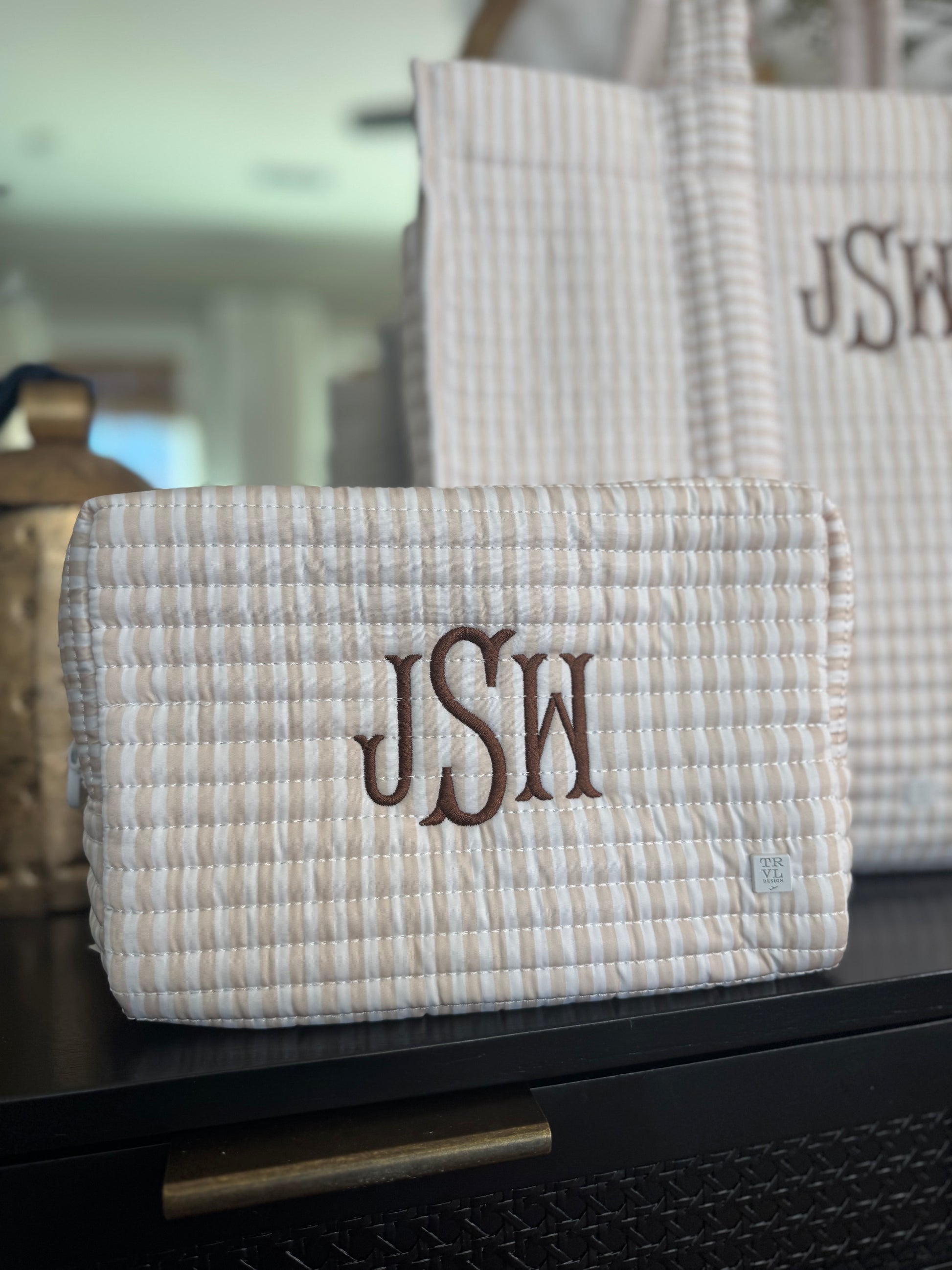 Perfect for Everyday use! This ultimate large, soft, lightweight quilted zippered pouch is ideal for diapers, wipes, toiletries, cosmetics and everything in between. This style is designed to stand on its own and has an interior pocket for smaller needs. Both functional and beautiful, this would be a great addition to any TRVL set and it is wipeable inside and out and machine washable.