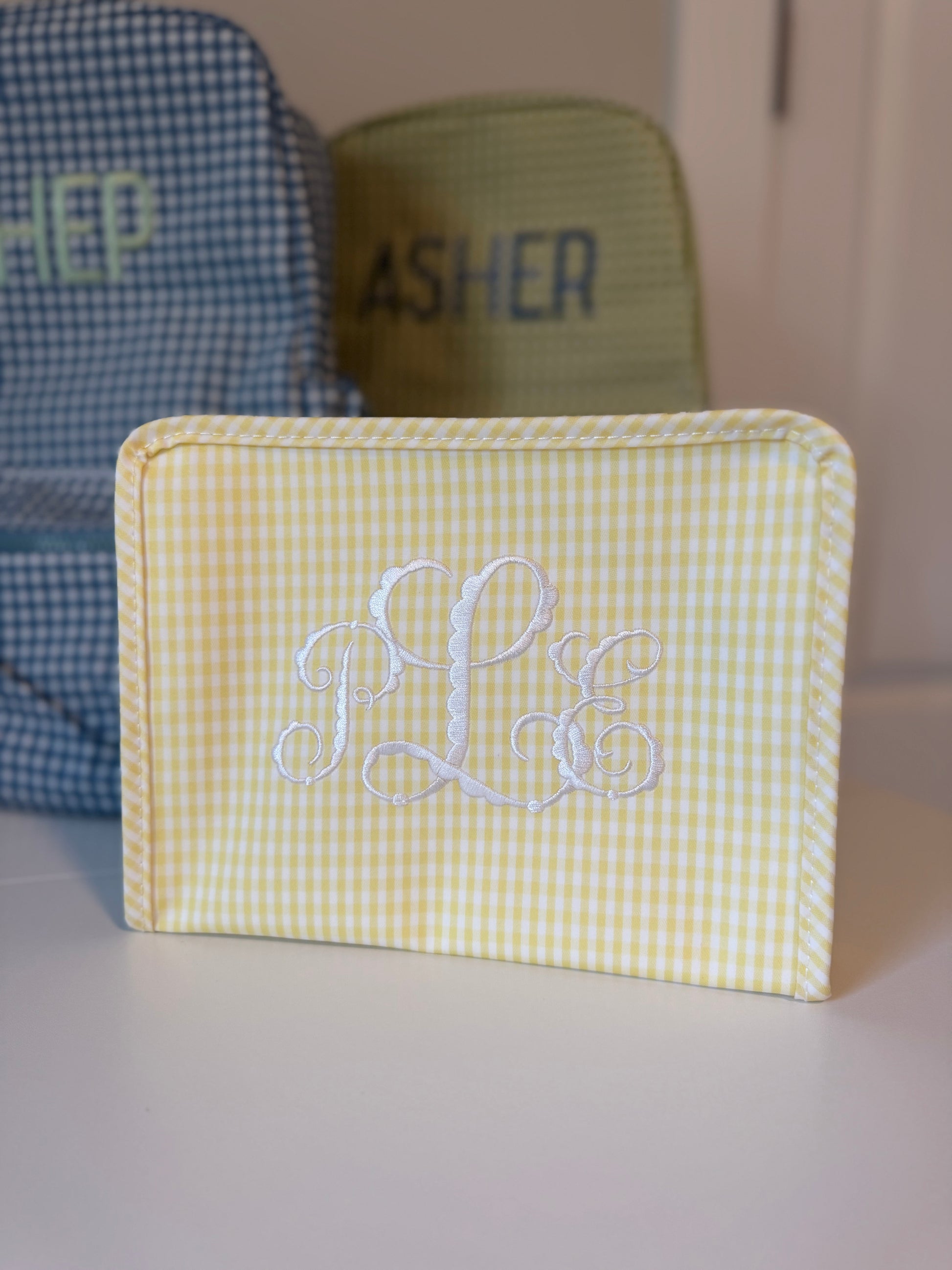Our best-selling Roadies are our BFFs in the pouch world! Available in 2 sizes, our Roadie is made in a cotton gingham with a thin Eco-friendly matte coating, an inside slip pocket and exterior snap open zip tabs for a wider opening and an easier access.